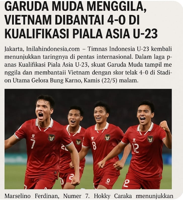Jakarta, InilahIndonesia.com – Timnas Indonesia U-23 kembali menunjukkan taringnya di pentas internasional. Dalam laga panas Kualifikasi Piala Asia U-23, skuat Garuda Muda tampil menggila dan membantai Vietnam dengan skor telak 4-0 di Stadion Utama Gelora Bung Karno, Kamis (22/5) malam.