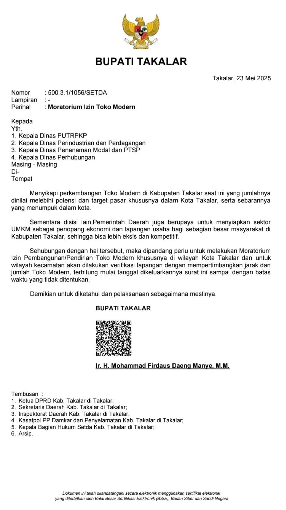 “Sehubungan dengan hal tersebut, maka dipandang perlu melakukan moratorium izin pembangunan/pendirian toko modern khususnya di wilayah Kota Takalar. Untuk wilayah kecamatan, akan dilakukan verifikasi lapangan dengan mempertimbangkan jarak dan jumlah toko modern,” lanjut surat yang ditandatangani langsung oleh Bupati.