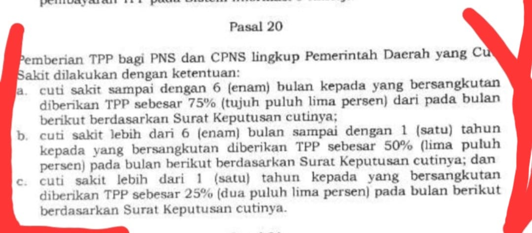 “Rata-rata ASN yang sakit 1–3 hari sesuai keterangan dokter tetap dipotong TPP. Padahal pemotongan 25 persen cukup besar, bagi staf bisa mencapai Rp250 ribu, eselon IV sekitar Rp500 ribu, bahkan eselon III hingga Rp750 ribu per bulan,” ungkap seorang ASN yang meminta identitasnya dirahasiakan.