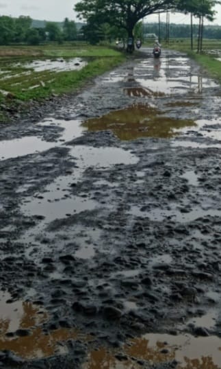 Jalan tersebut tampak rusak parah dan dipenuhi lubang serta genangan air, sehingga sulit dilalui kendaraan, terutama saat musim hujan.