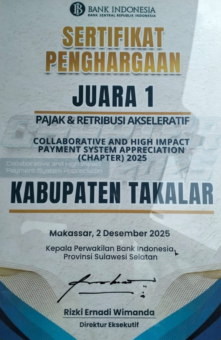 Takalar kembali mengukir prestasi besar dengan meraih Juara 1 Lomba Pajak & Retribusi Akseleratif yang digelar oleh Bank Indonesia (BI) di Hotel Claro, Selasa pagi (2/12/2025).