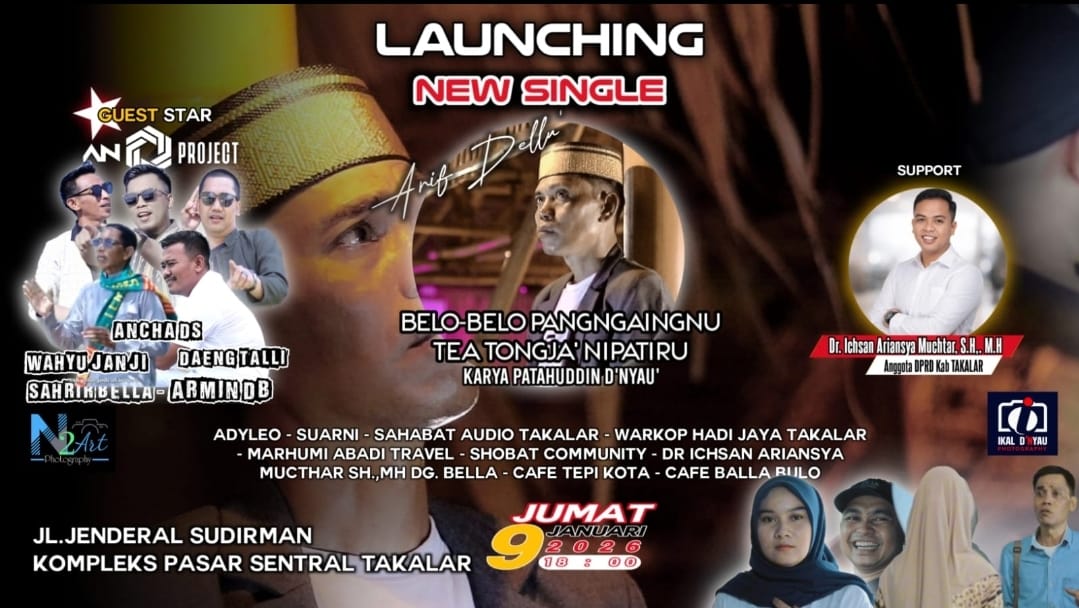 Peluncuran lagu daerah karya anak Takalar akan digelar di pelataran kios Pasar Sentral Takalar pada Jumat, 9 Januari 2026, pukul 18.30 WITA hingga selesai.